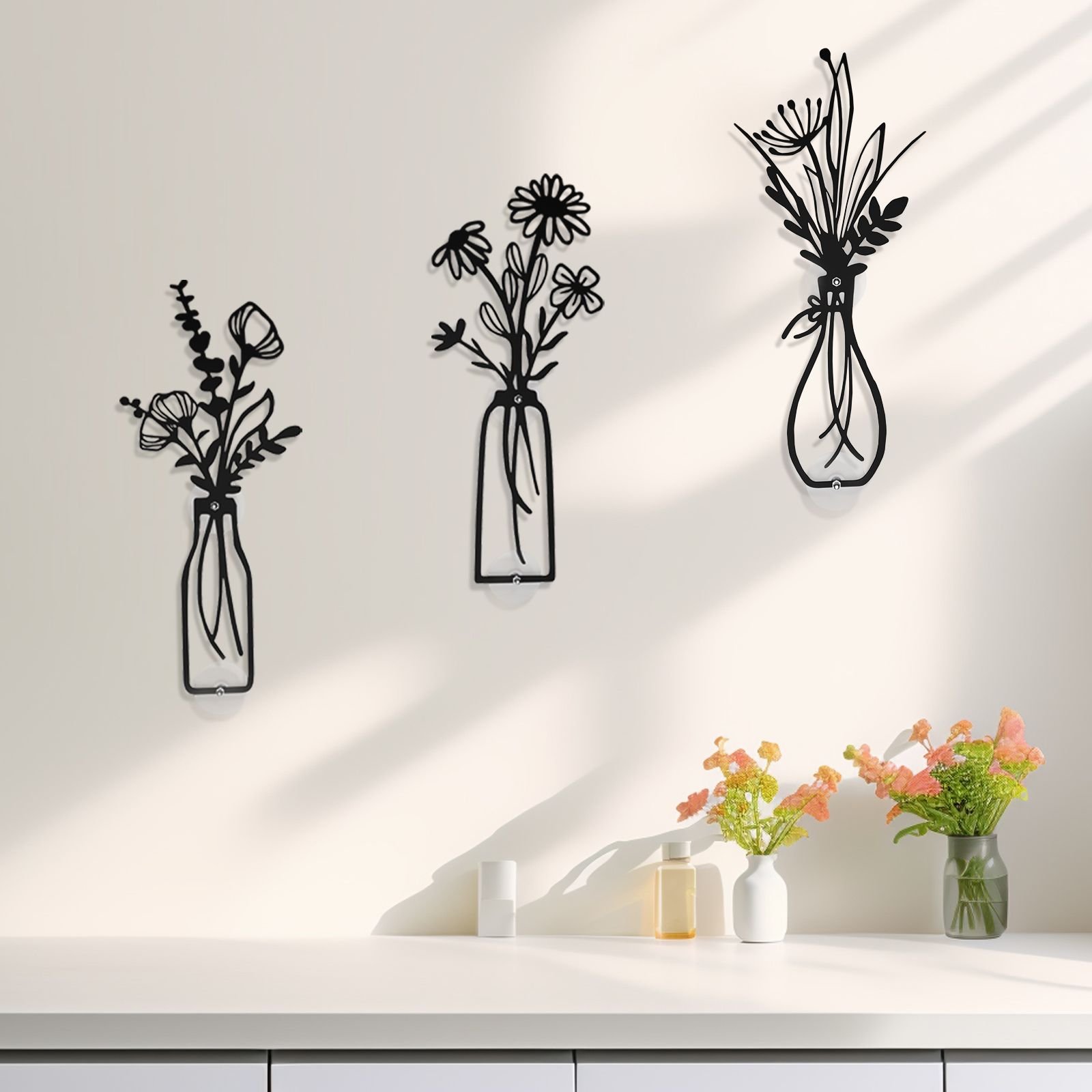 Home > 3-Piece Metal Vase Floral Wall Art - Rustic Farmhouse Decor Metal Wall Art Black Minimalist Floral Nature Theme Wall Decor Suitable for Home Bedroom D