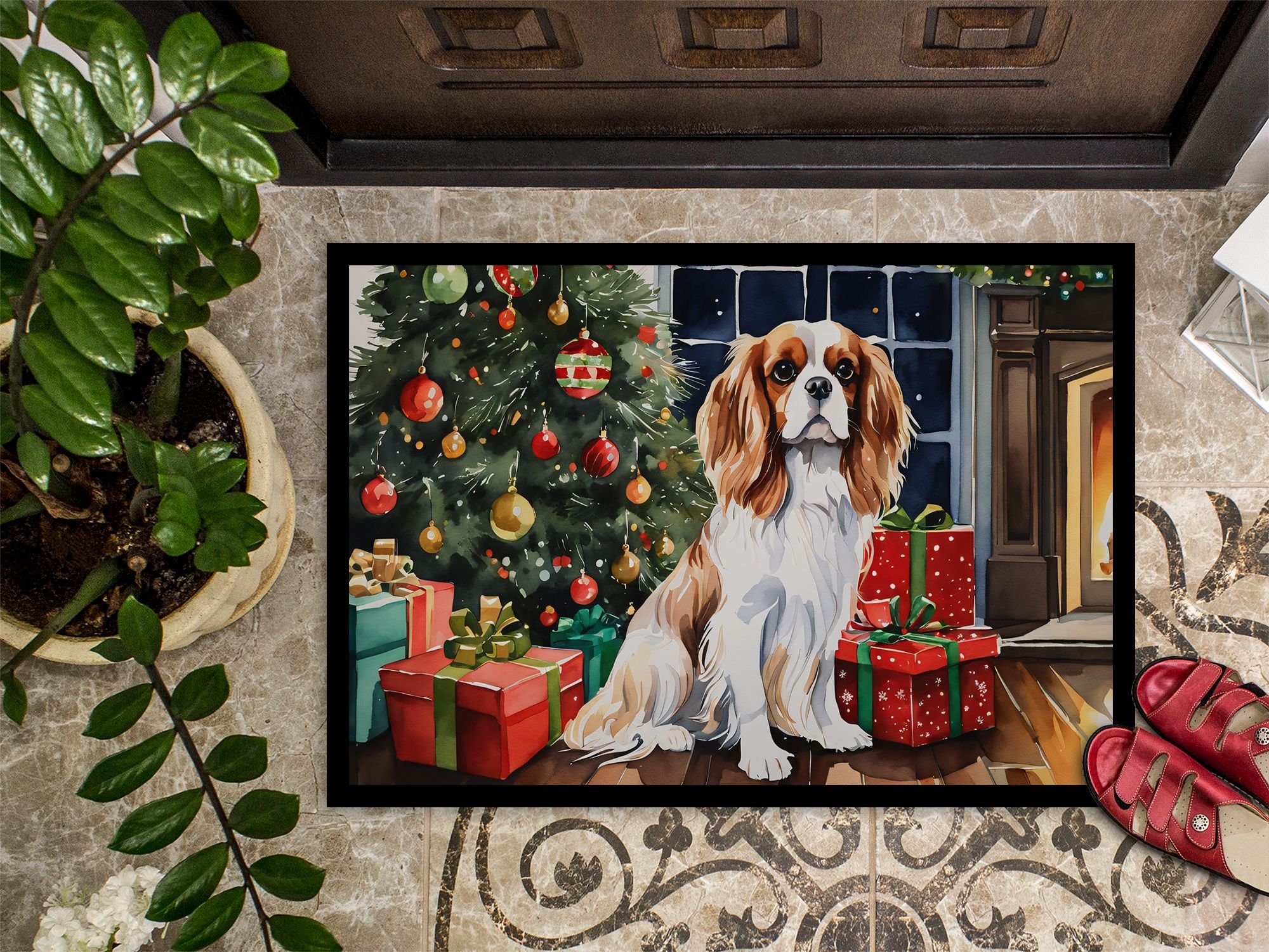 Doormat featuring breed specific Cavalier King Charles Spaniel artwork. Celebrate Christmas with this Christmas Doormat. Welcome your guests in style with our Artwork Door Mat, designed to withstand almost any weather condition. This mat, measuring approximately 18 by 27 inches, is held together by durable black binding tape. Its top layer, composed of polyester felt, is dyed with the eye-catching image you see on the mat. A few layers below provide the mat with stability, while its rubber bottom is stamped to help prevent slipping and ensures safety. Our mat works wonderfully as both an indoor or outdoor door mat. For cleaning, simply hose it off with water or use a power washer - no need for any cleaner that produces suds. Avoid scrubbing with a brush, instead, opt for the vacuum on floor setting. Designed manufactured and printed in the USA, this mat is a perfect addition to your porch, outdoor kitchen, entryway, or any indoor space. Its unique design makes it a charming decorative rug that greets your guests and adds a stylish touch to your home decor.