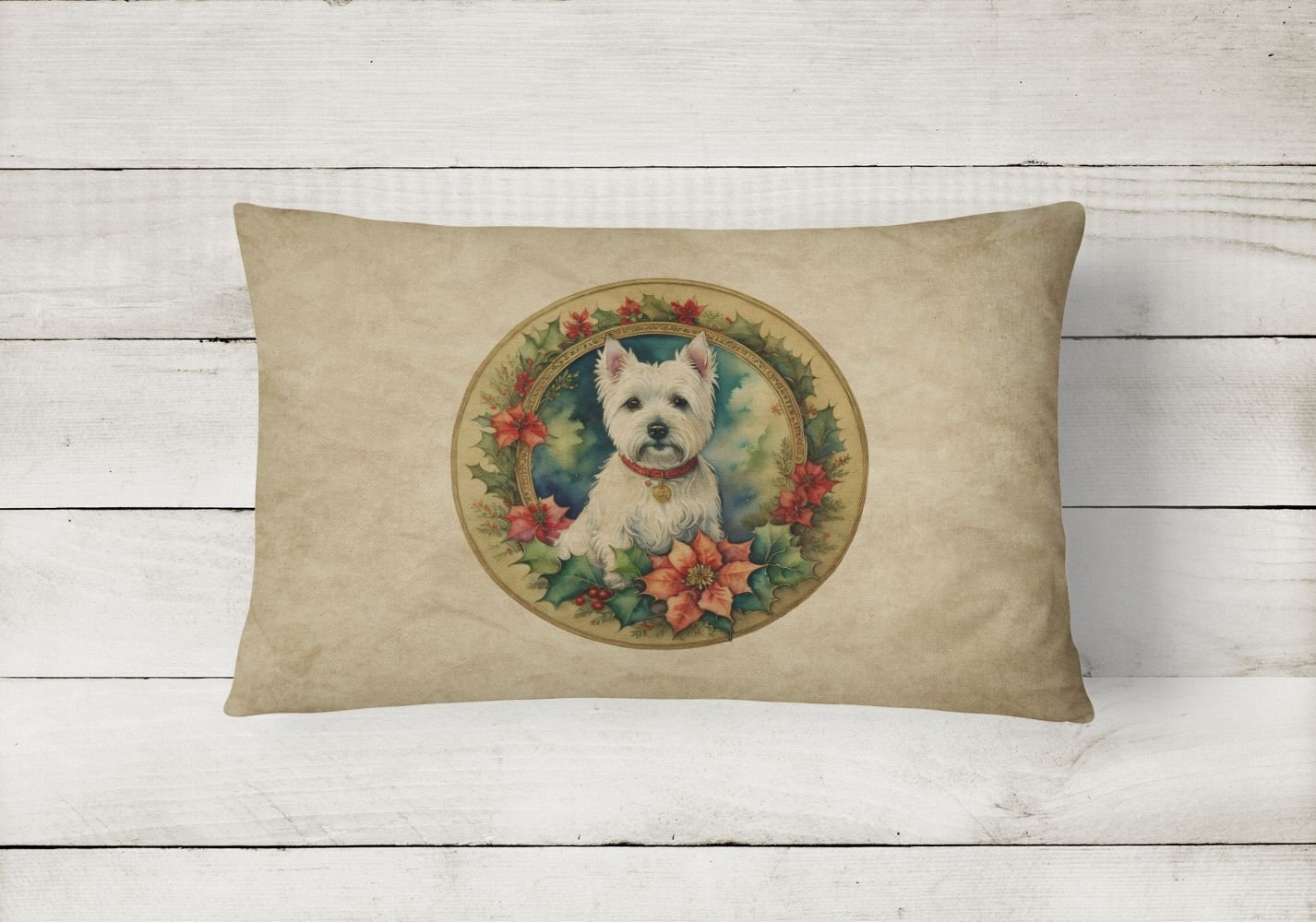 Throw Pillow featuring breed specific West Highland White Terrier artwork. Celebrate Christmas with this Christmas Pillow. Embrace the fusion of comfort and style with Caroline's Treasures Fabric Decorative Pillow. This 12x16 inch outdoor pillow is designed to complement your patio furniture, adding a splash of color and artistry to your outdoor setting. Constructed with a 100% Polyester Fabric pillow sham filled with a plush pillow form, this cushion is as comfortable as it is durable. Our outdoor pillow utilizes a novel fabric, meticulously woven for enhanced water resistance. This soft canvas material is equally suited for your indoor couch as well as outdoor settings such as the patio, porch, or veranda. To ensure enduring vibrance, we employ colorfast dyes resistant to fading even when subjected to weather elements. The making of this pillow involves the delicate sewing together of three fabric pieces to create a sham, into which a polyester insert is carefully placed. The result is an overstuffed pillow that tenaciously holds its shape. With both the sham and the pillow insert crafted in the United States, these handmade pillows are a testament to superior local craftsmanship. Note that as these pillows are handmade, sizes may slightly vary, enhancing their unique appeal. Enjoy comfort in style with Caroline's Treasures Fabric Decorative Pillow.