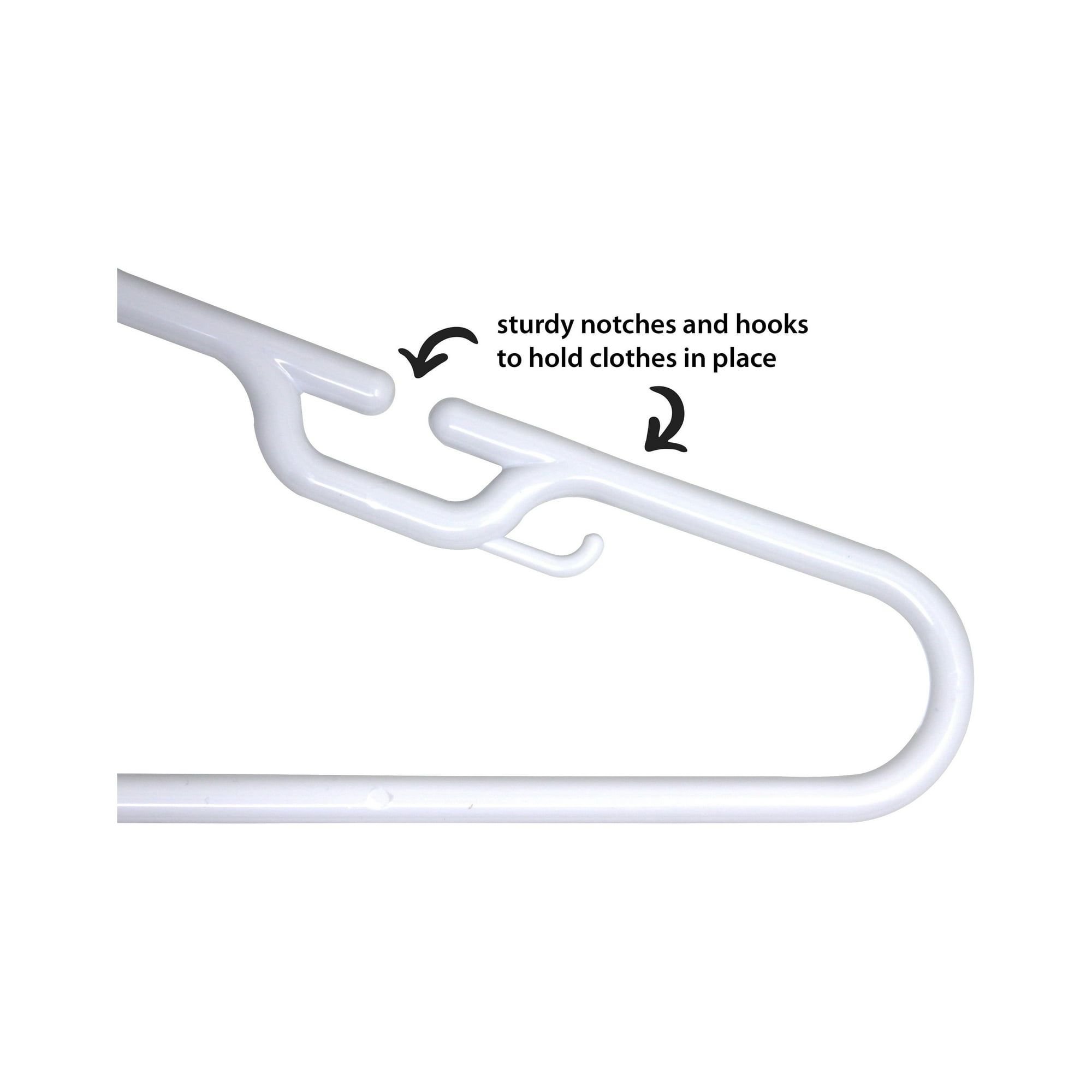 Improve your organization of XL heavier garments using these White Plastic Heavy Duty Notched Giant Hangers, 3-Pack. They're longer in length (19 1/2) which makes them ideal for hanging a variety of XL clothing pieces. They are durable and sturdy and designed for winter coats, jackets, sweaters and much more. No more hanger breakage or sagging hangers due to your heavier garments. These hangers eliminate the creases made on clothing and strong enough to bear the weight for a long time. Utilize these hangers to keep your oversize garments and winter jackets neat and organized in the closet, dorm, or laundry room. The shape & smoothness of this hanger helps keep winter sweaters in shape & snag free! 3-Pack Giant Plastic Hangers (White), feature notches to help keep your favorite clothing items with straps safe and secure. They are A and stand to standard! Perfect for teen ages and adults.