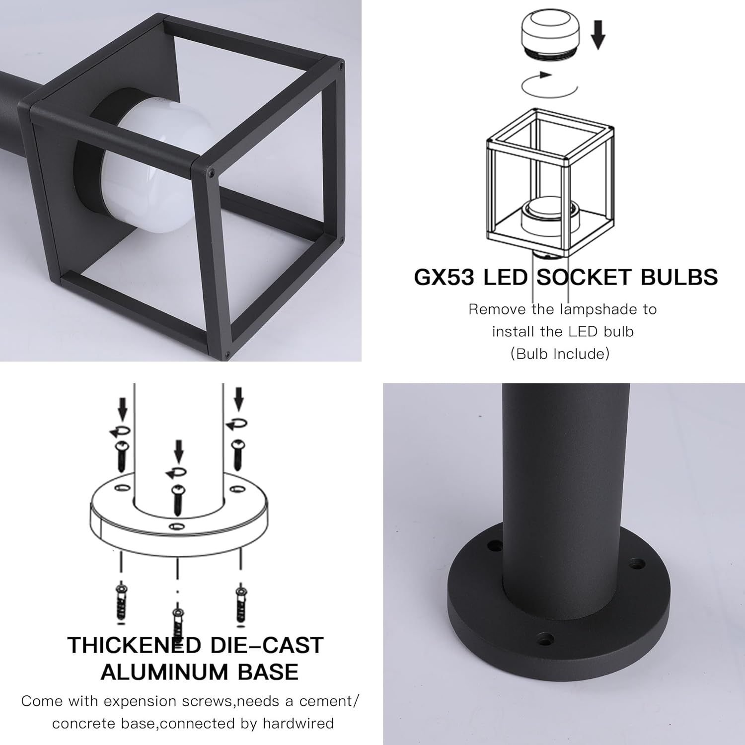 4.Easy to Installation: 120V voltage power supply,bollard light needs a cement or concrete base to install.The garden floor lamp connected by hard wired.outdoor fixture including all mounting accessories,no assembly.