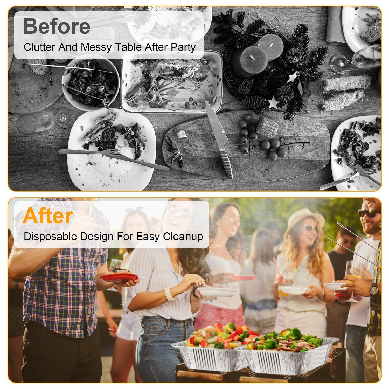 Perfect For Various Occasions: From private events to social gatherings, this disposable chafing dishes for buffet is a versatile and essential addition to any event, such as weddings, birthday celebrations, office parties, special anniversaries and BBQ parties.
